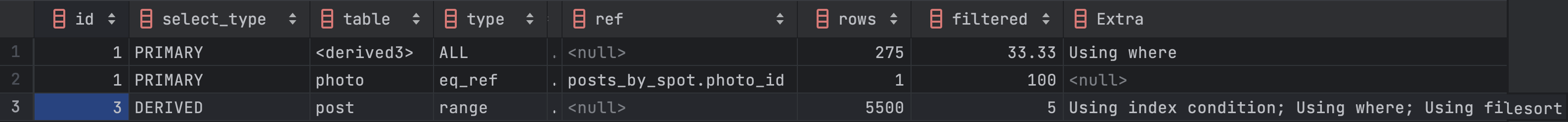 - DERIVED는 단위 SELECT 쿼리의 실행 결과로 메모리나 디스크에 임시 테이블(파생 테이블)을 생성하는 것을 의미하는데 주로 from절 서브쿼리를 사용하는 경우를 나타낸다. (성능상 주의깊게 볼 부분)
