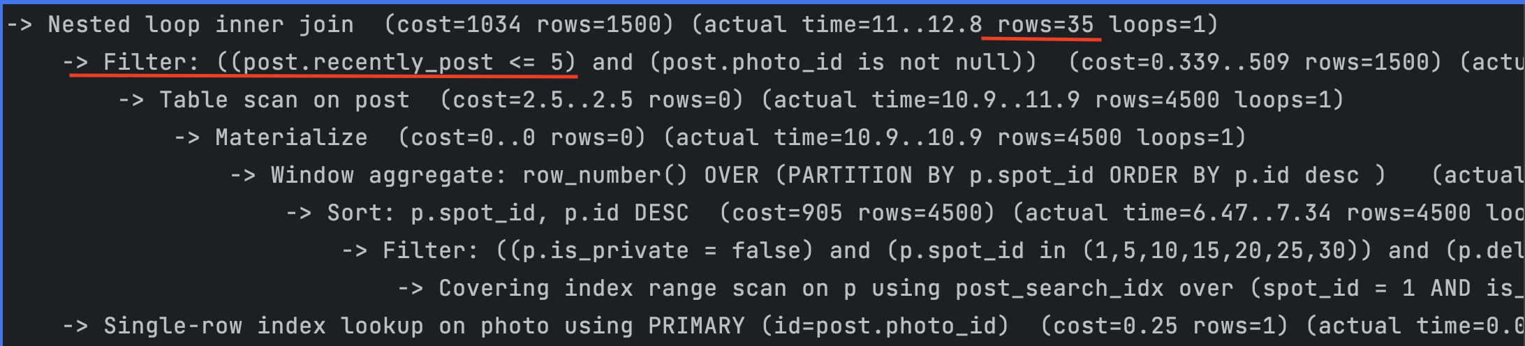 explain analyze로 검색하면 쿼리의 실행 계획과 단계별 소요된 시간 정보를 확인할 수 있다.
