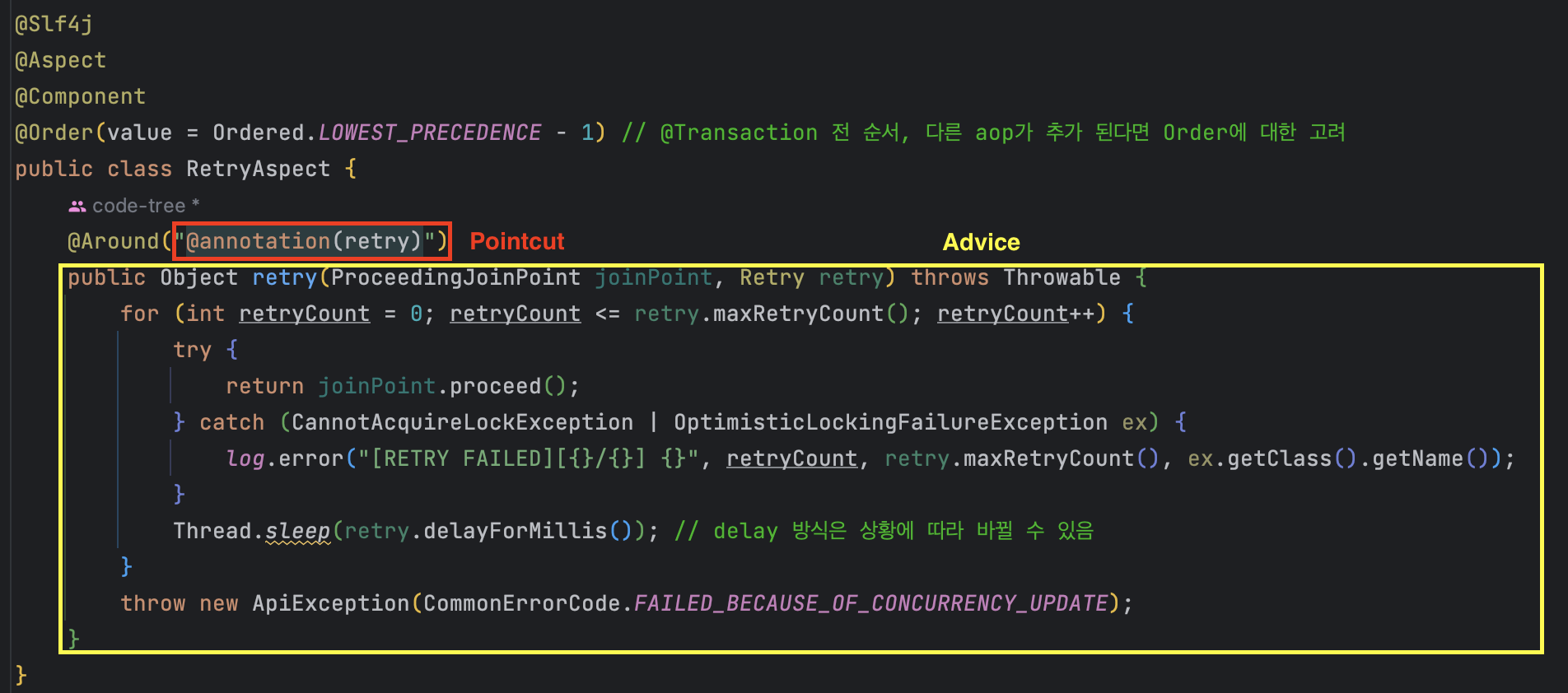 Optimistic Lock 예외를 클라이언트한테 에러로 응답해 주면 클라이언트는 매우 불편할 것이다. 그래서 Optimistic 예외 발생 시 재시도를 위해 스프링 AOP로 Retry를 추가해 줬다.