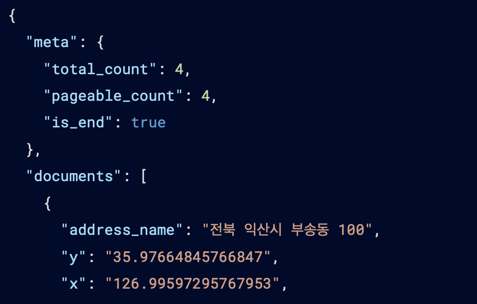 카카오맵 API의 Json 응답 예시를 보면 SnakeCase 표기법으로 되어 있는데 기본적으로는 CamelCase 표기법으로 읽기 때문에ObjectMapper에 별도로 setPropertyNamingStrategy()로 설정을 해줘야 한다.