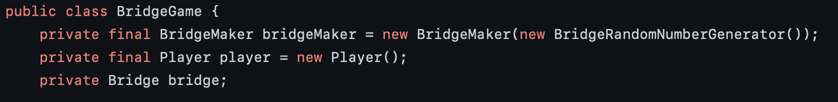 추가로 BridgeMaker는 처음에 한번 다리를 생성하는 역할만 하기 때문에 BridgeGame의 필드로 선언할 필요가 없는 것 같다.