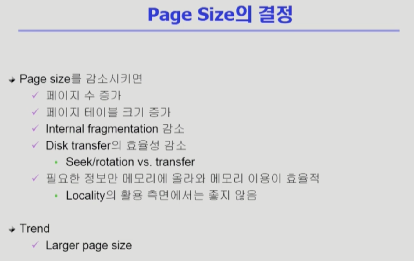 페이지 단위가 너무 작으면 내부 단편화를 방지할 수 있지만 페이지 테이블 크기가 증가하고 Page Fault로 인한 Disk I/O가 많이 발생한다. 반면 페이지 단위가 클 경우 내부 단편화와 transfer 시간이 오래 걸리고 필요없는 정보까지 메모리에 올라오는 단점이 있다.