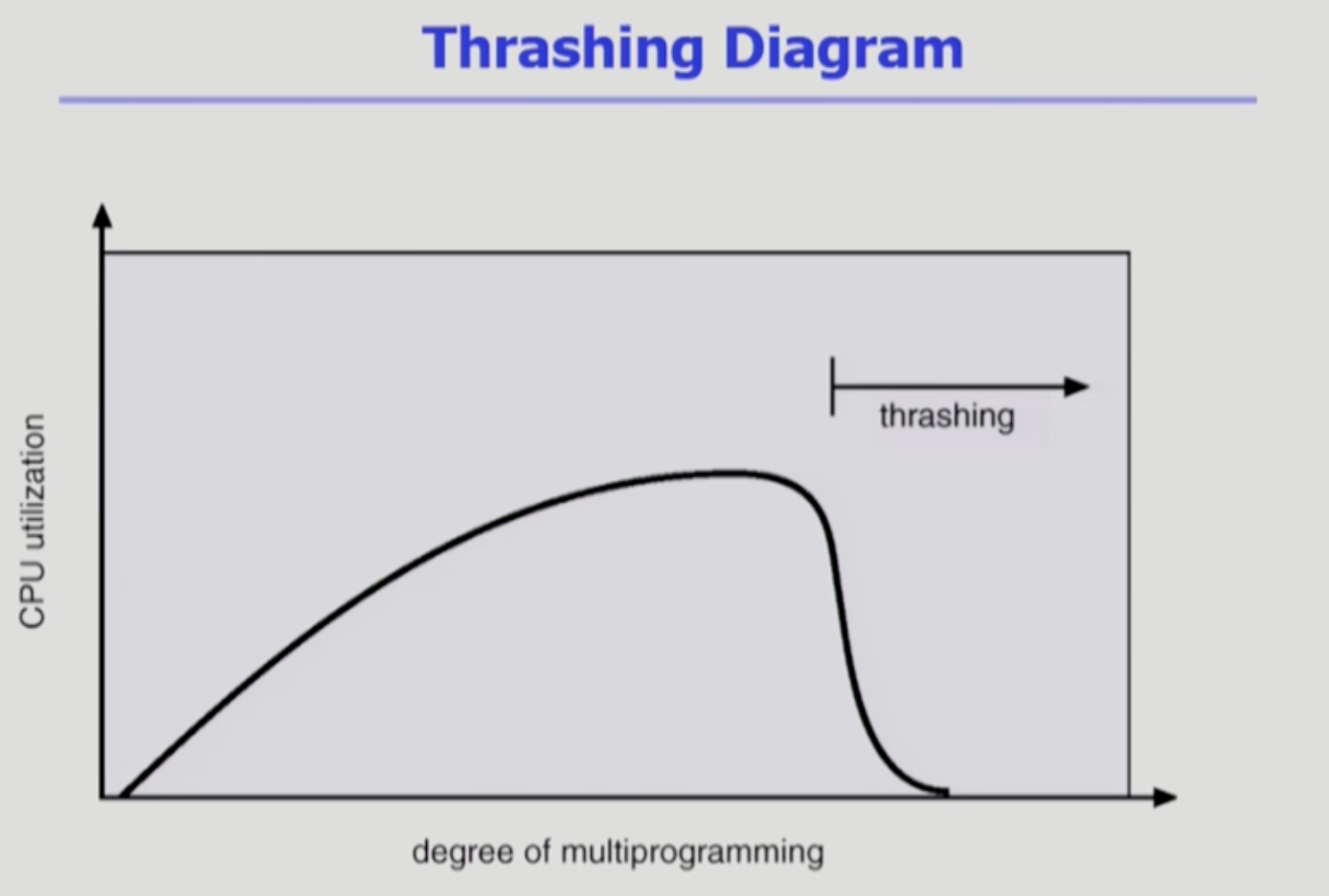 동시에 실행되는 프로그램이 증가하면 프로세스마다 할당되는 메모리가 부족해지고 최소한의 page frame을 할당받지 못해서 Page Fault가 증가하게 된다. 그러면 Disk I/O 작업으로 인해 CPU 이용률이 떨어지게 되는데 이때 운영체제는 CPU 이용률이 부족한 것을 멀티프로그래밍 개수를 늘려야겠다고 판단하는데 이러한 현상을 Thrashing이라 한다.