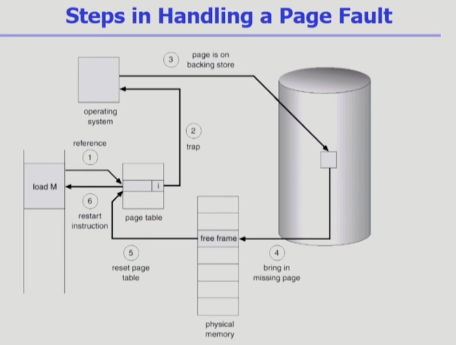 page fault가 발생하면 MMU(메모리 주소 변환을 해주는 하드웨어)는 trap을 발생시키는데 이때 CPU가 현재 프로세스에서 운영체제로 넘어가고 page fault handler가 동작한다 .
