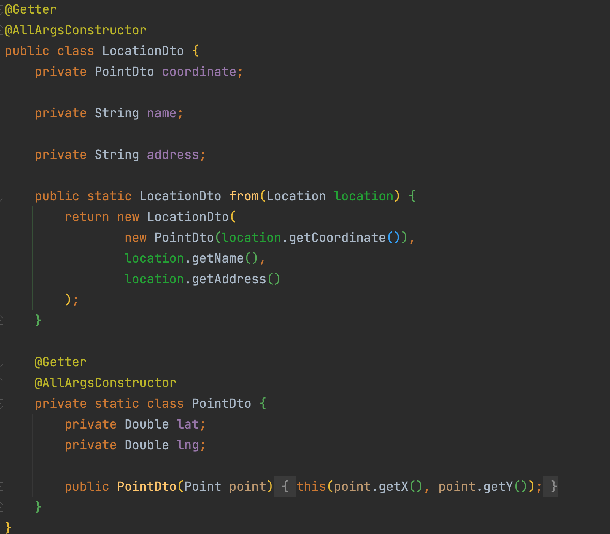 Point를 그대로 반환하면 Json이 변환을 못해서 추가 처리를 해야 되는데 간단하게 X, Y값을 빼내서 Dto로 만들었다.