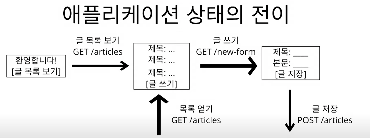 브라우저가 보여주는 페이지가 바뀌는 것을 웹 애플리케이션의 상태가 변경되었다고 말하는데 표현(representation)을 통해 웹 애플리케이션의 상태(State)가 변경(Transfer)되는 것이다.